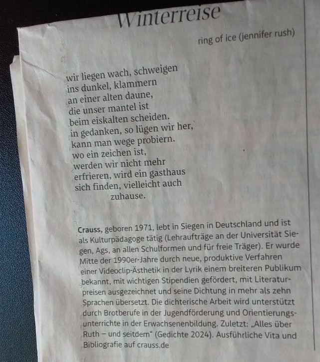 Dass Crauss Maßstäbe setzt, was zeitgenössische Lyrik angeht, steht nicht erst seit Friederike Mayröckers Diktum “So müssen Gedichte heute sein!” fest. Im Sommer war Crauss nochmals Standard: mit einem Gesprochenen Lied, nämlich Jennifer Rushs “ring of ice” wurde er in der wichtigsten österreichischen Tageszeitung präsentiert. Danke an Timo Brandt für die Auswahl.